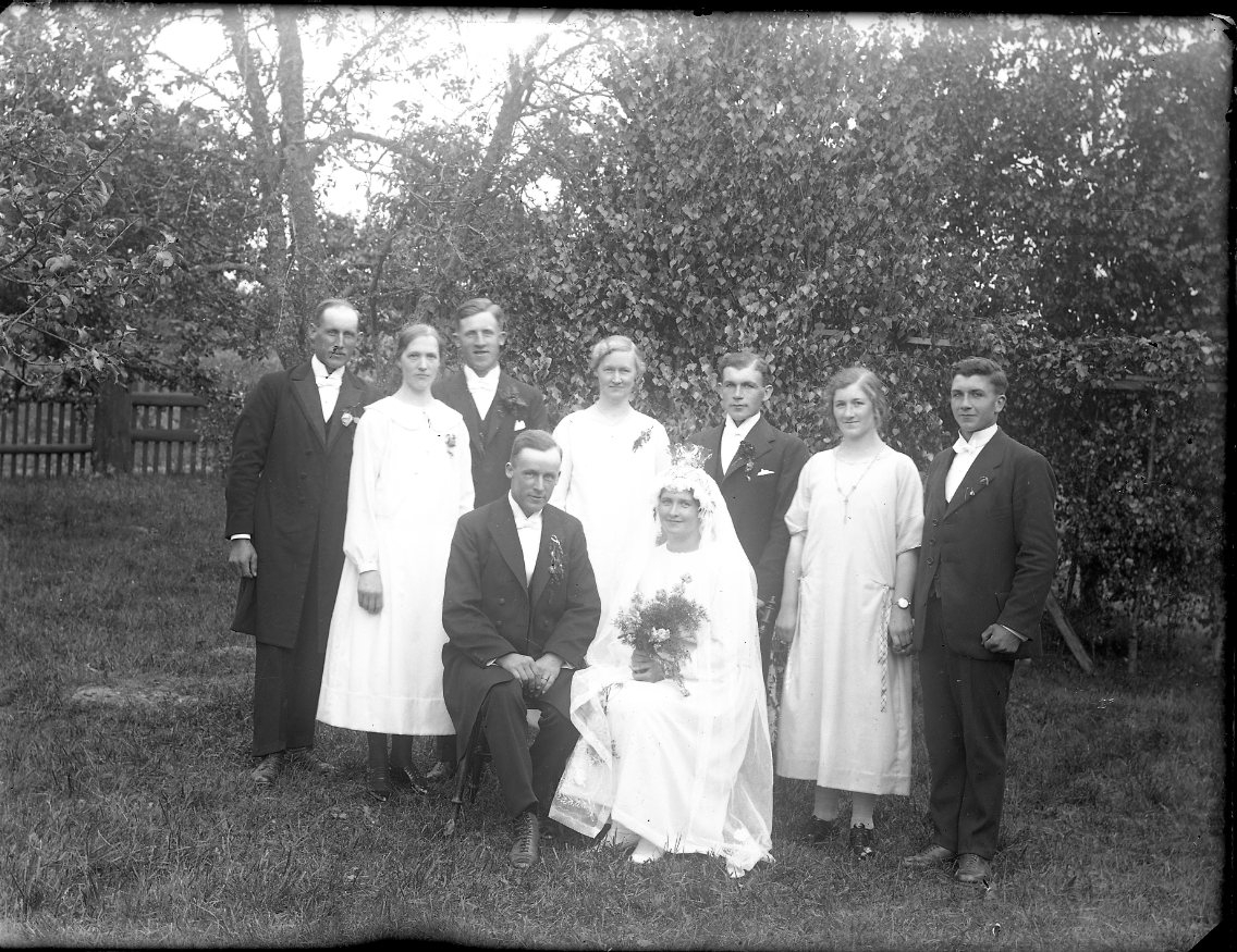 Ett sittande brudpar med ett mindre sällskap stående bakom. Utomhus.