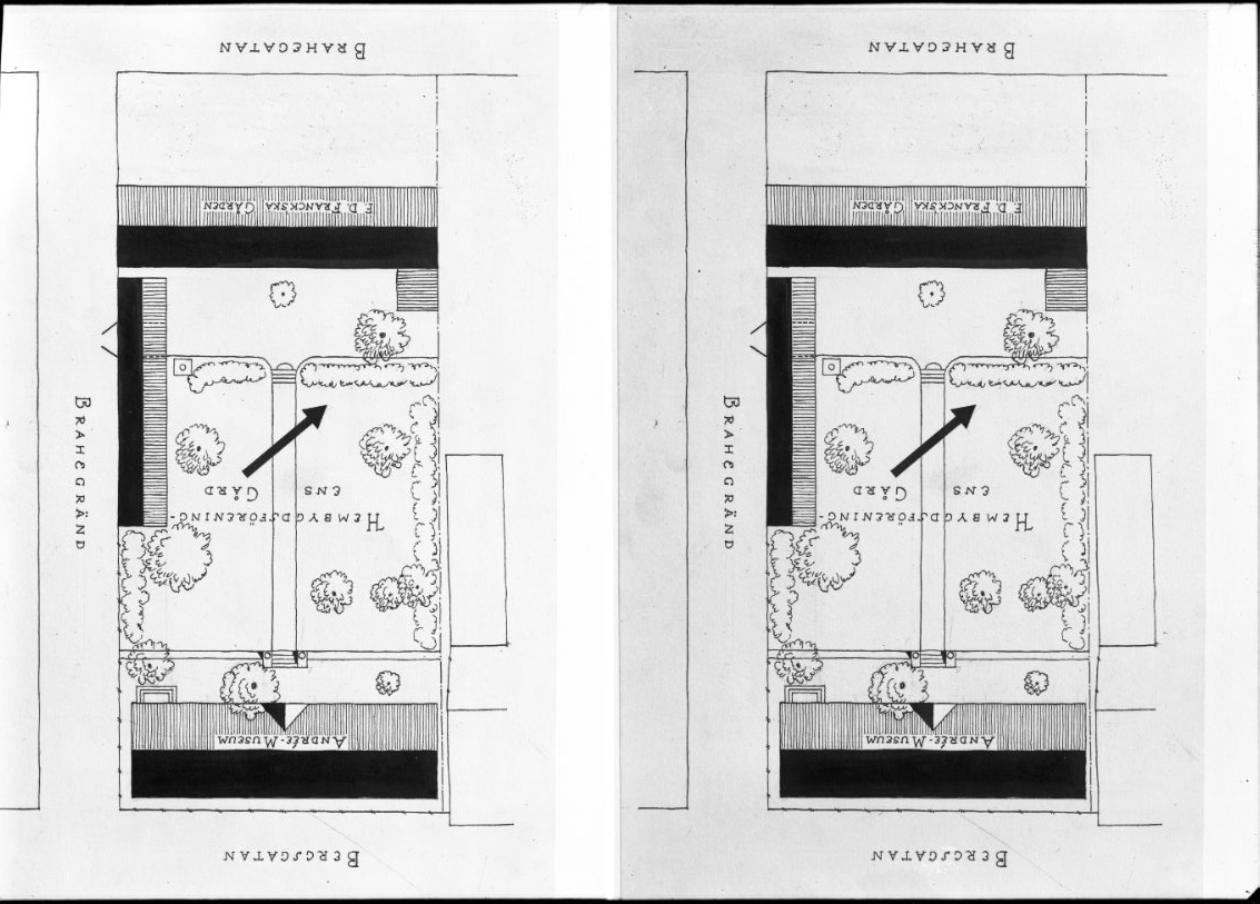 Illustration av tomten nr 75, dåvarande kvarteret Hjorten 3 med inritade byggnader, bland annat Andréemuseet.
