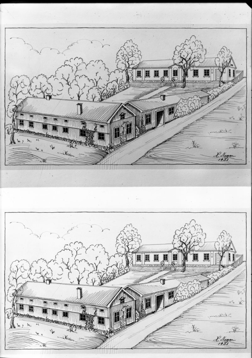 Illustration av tomten nr 75, dåvarande kvarteret Hjorten 3 med inritade byggnader, bland annat blivande Andréemuseet. Signerad "H. Norgren 1931"