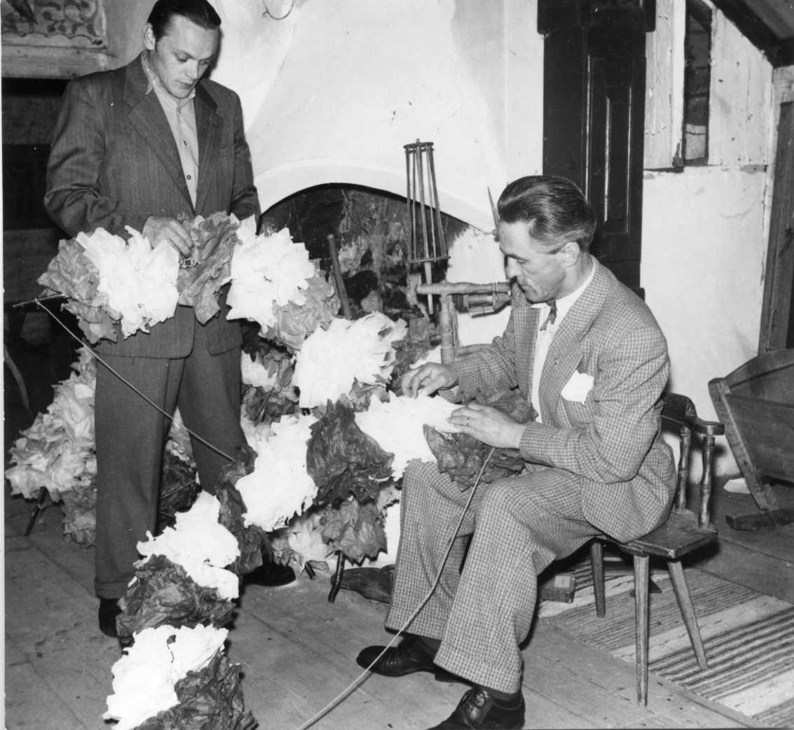 Två män binder girlanger till en hembygdsfest. De befinner sig i en stuga på friluftsmuseet på Grännaberget.