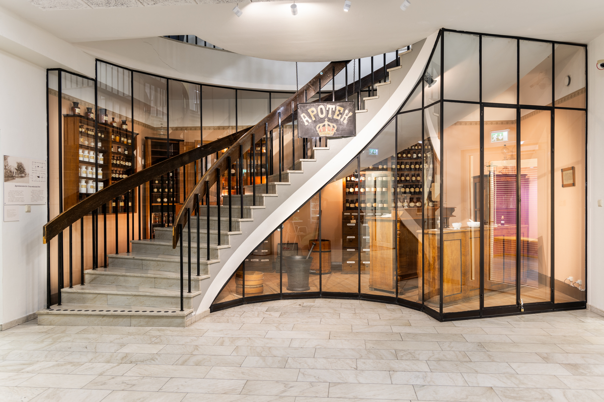 Apoteksmuseet i Hälsohögskolan i Jönköping. Utställningen producerades 1982 av Jönköpings läns museum i samarbete med dåvarande Munksjöskolan. Vid den tiden bedrev Jönköpings läns landsting vårdutbildningar i byggnaden.