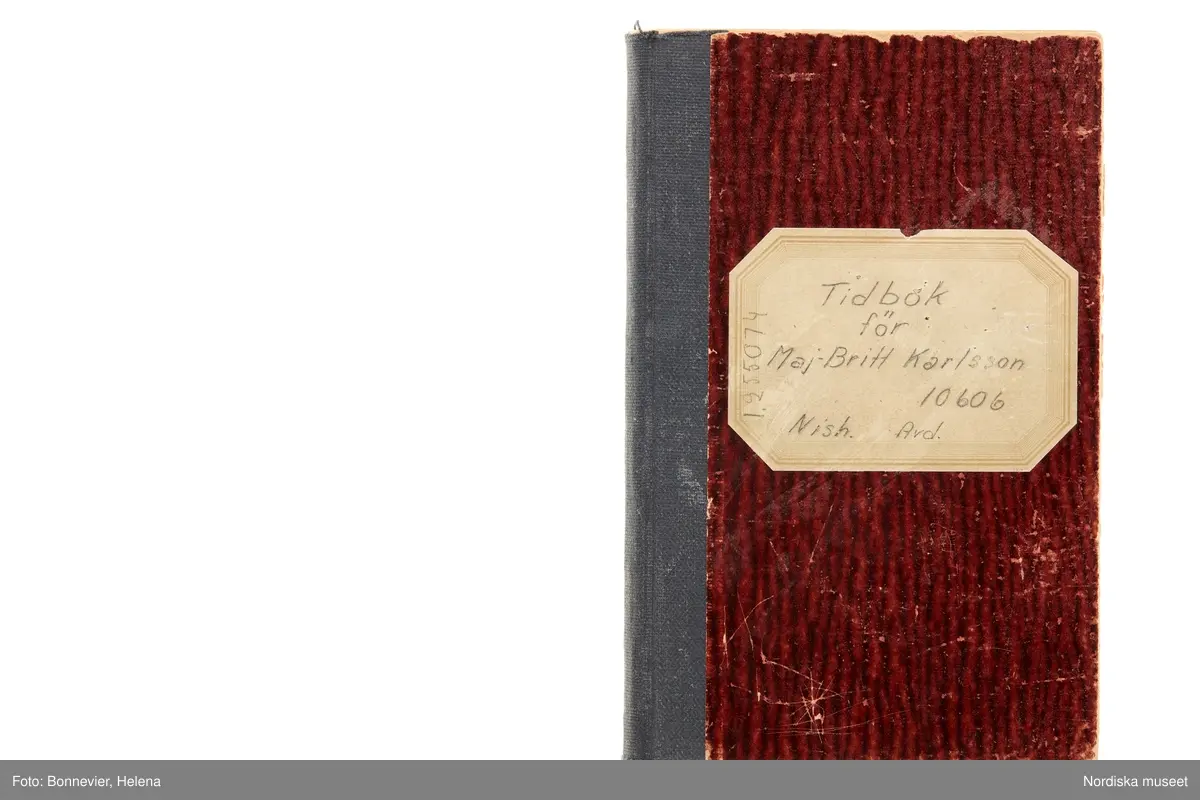 Tidbok som sträcker sig från 1947 till 1949, har tillhört sömmerskan Maj-Britt Karlsson (Hemlin) på NK:s Franska damskrädderi. Här kan utläsas kundernas namn, arbetstimmar samt materialangivelser.