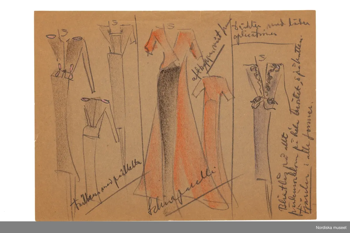 Modeskisser utförda av Pelle Lundgren (1896-1974) kreatör, från 1923 förste försäljare och senare ateljéchef på NK:s Franska damskrädderi. Från 1965 till stängningen av verksamheten 1966 var han disponent. Pelle Lundgrens minnesskisser från de kända modehusen i Paris är tecknade efter visningarna, i ritblocket eller på det som fanns till hands som hotellets brevpapper. De snabba skisserna inspirerade ateljéns egna modeller. Här ses teckningar utförda våren 1937 med plagg från exempelvis Schiaparelli, Patou, Molyneux, Paquin, Francevramant, Rouff, Rochas, Mainbocher, Vionnet, Lanvin och Lelong.
