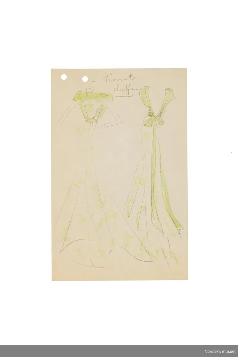 Modeskisser utförda av Pelle Lundgren (1896-1974) kreatör, från 1923 förste försäljare och senare ateljéchef på NK:s Franska damskrädderi. Från 1965 till stängningen av verksamheten 1966 var han disponent. Pelle Lundgrens minnesskisser från de kända modehusen i Paris är tecknade efter visningarna, i ritblocket eller på det som fanns till hands som hotellets brevpapper. De snabba skisserna inspirerade ateljéns egna modeller. Här ses teckningar utförda våren 1936 med plagg från exempelvis Vionnet, Molyneux, Talbot, Lanvin, Alix, Agnès och Lelong.
