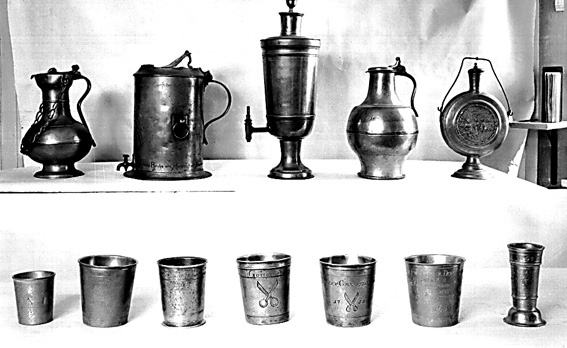 Pokaler, stop och kannor samt flaskor i metal.