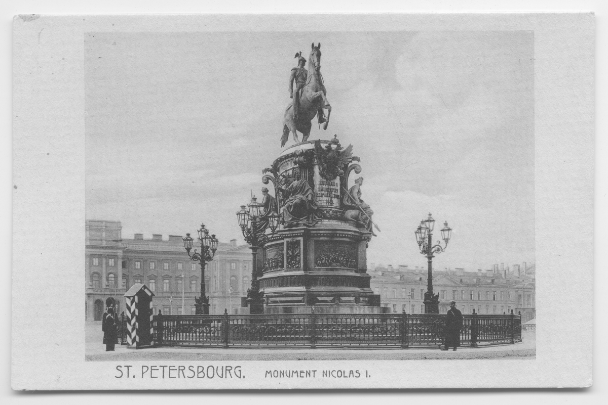 På kuvertet står följande information sammanställd vid museets första genomgång av materialet: Kejsar Nicolas I staty.