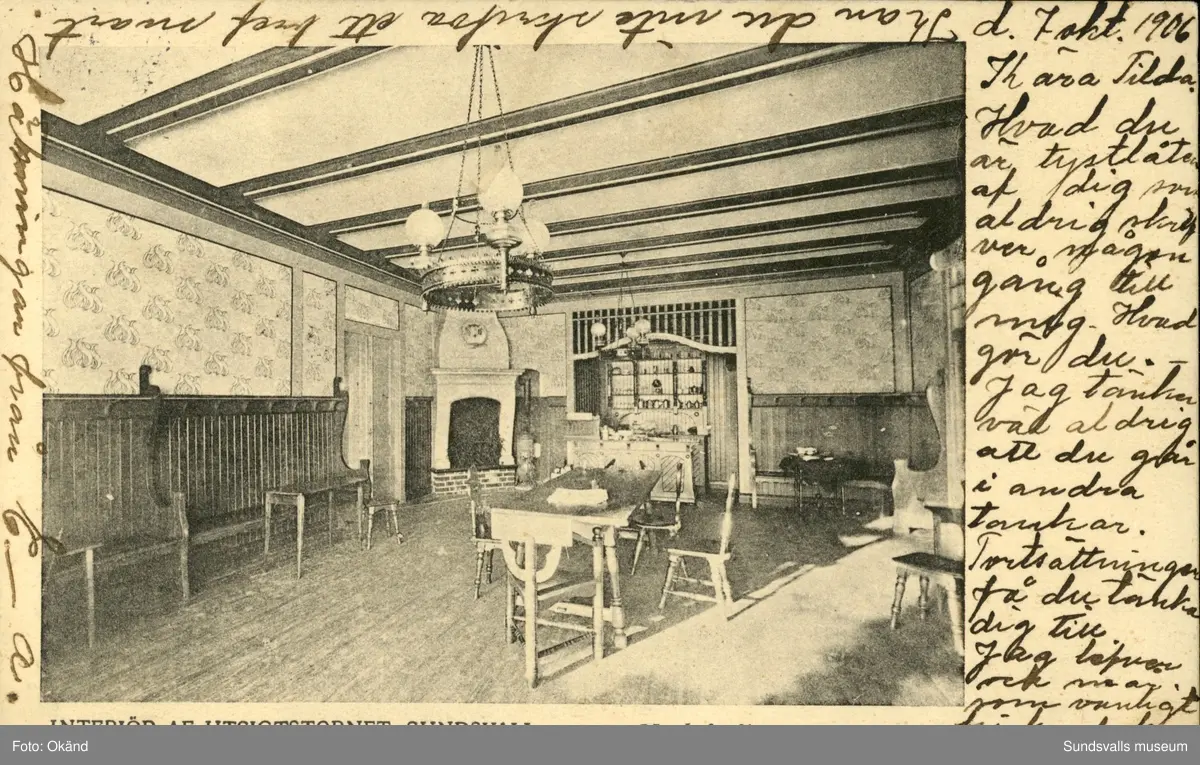 Vykort med motiv över interiören i Turistpaviljongen i Sundsvall.