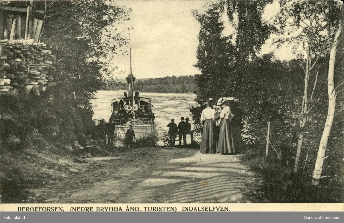 Vykort med motiv över den nedre bryggan i Bergeforsen och ångbåten Turisten som trafikerade Indalsälven.