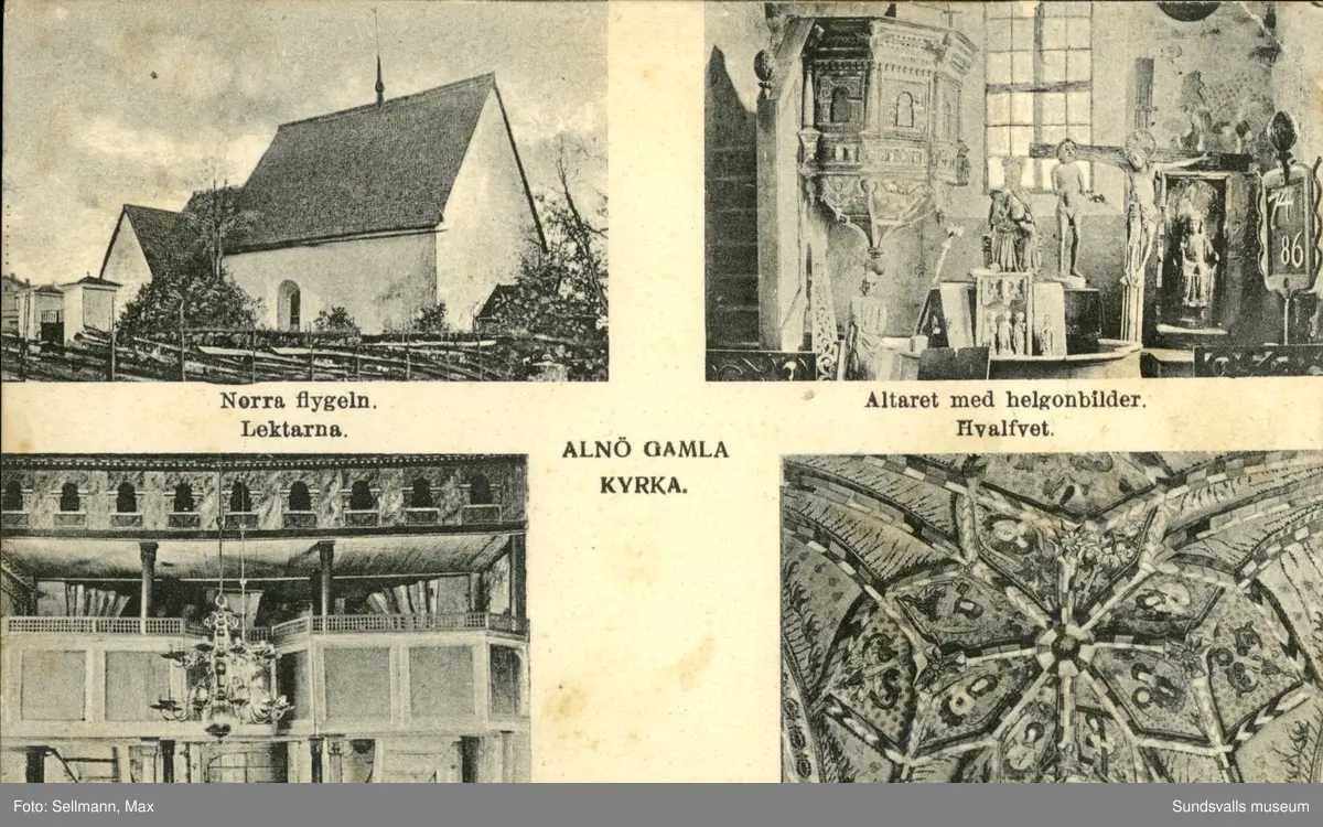 Vykort med motiv över norra flygeln, läktarna, altaret och valvet i gamla kyrkan på Alnö.