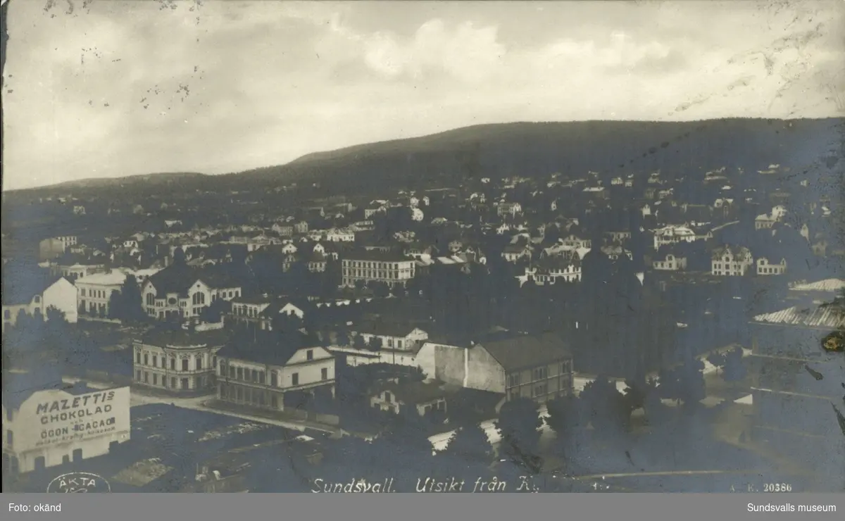 Vykort med motiv över Sundsvall sett från Gustav Adolfs kyrktorn.