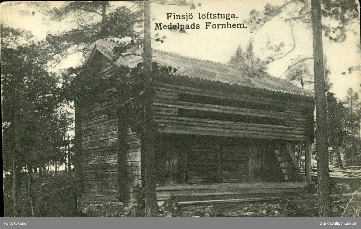Vykort med motiv över Medelpads fornhem på Norra Stadsberget i Sundsvall med texten: Finsjö loftstuga.