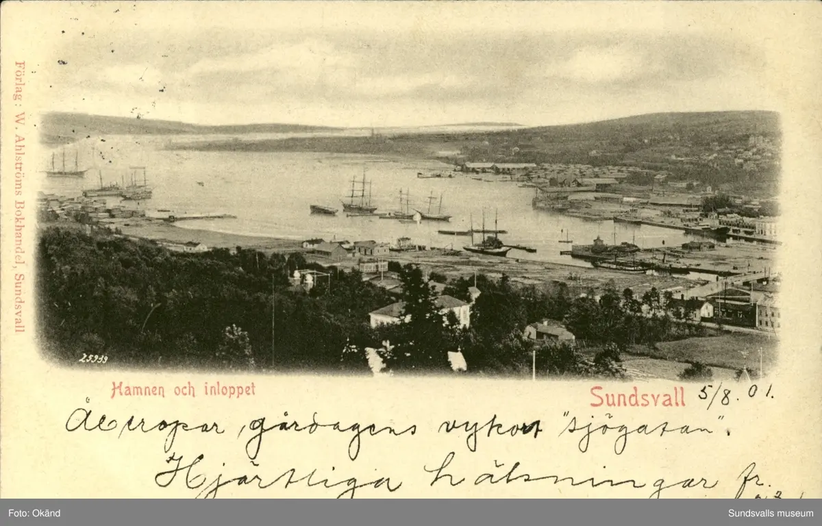 Titel: Vykort med motiv över hamnen och inloppet i Sundsvall.