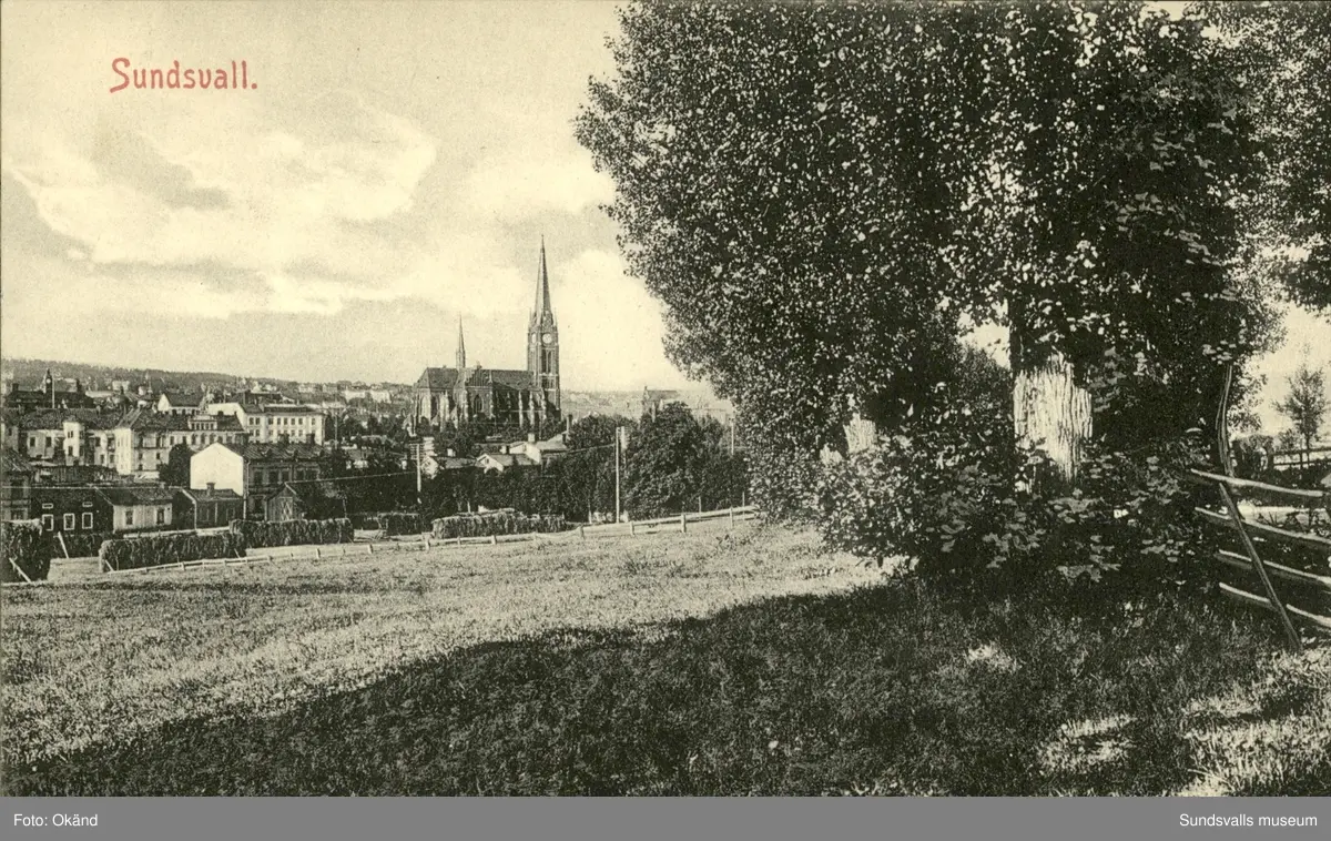 Vykort med motiv över parti av Sundsvall och Gustav Adolfs kyrka.