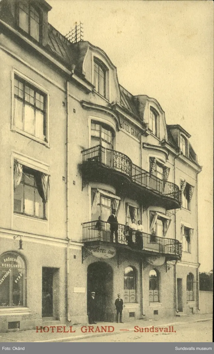Vykort med motiv över Hotell Grand på Trädgårdsgatan 4 i Sundsvall.