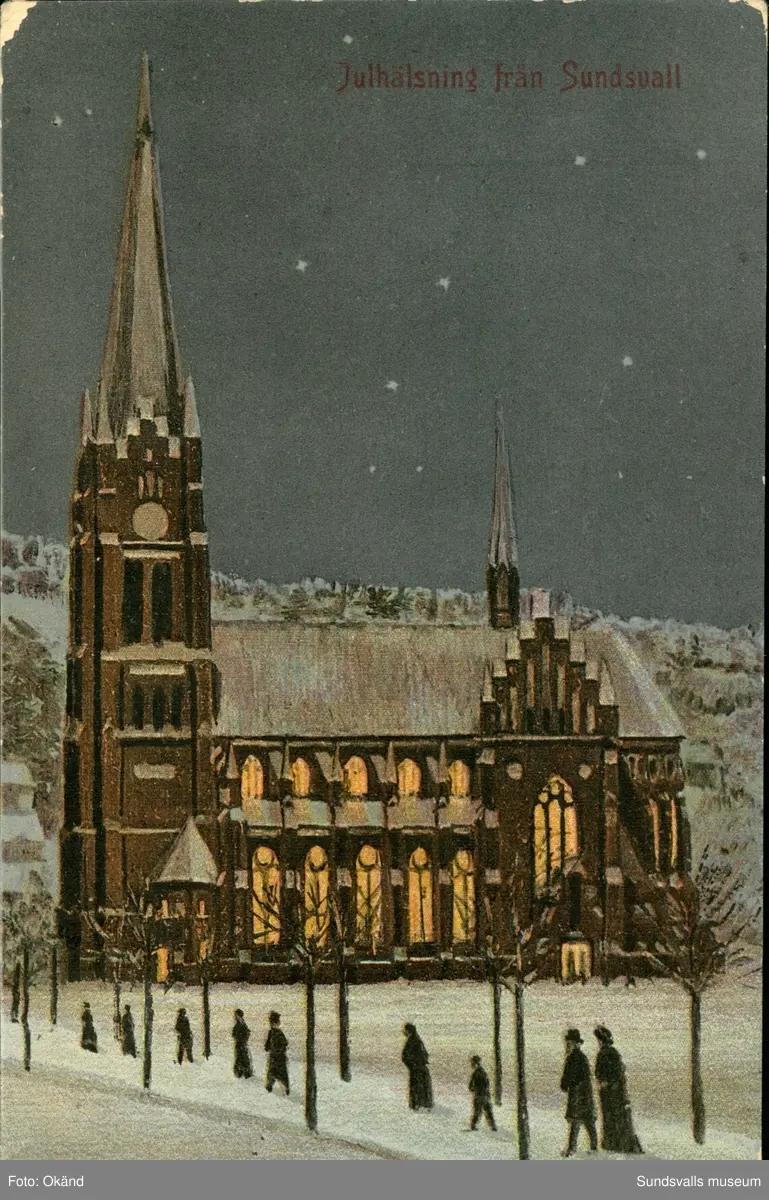 Vykort med vintermotiv över Gustav Adolfs kyrka och texten: Julhälsning från Sundsvall.