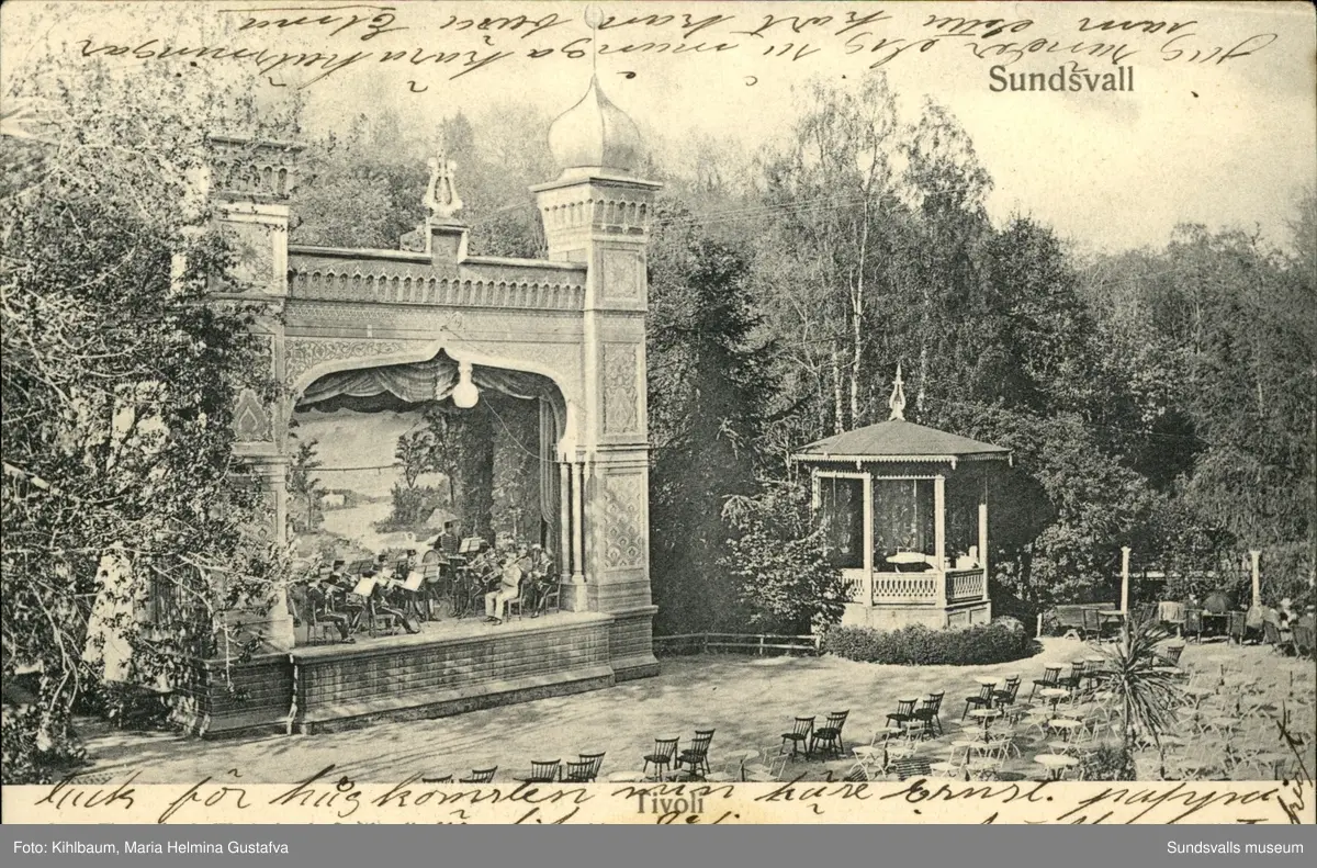 Vykort med motiv över musikpaviljongen på Tivoli i Sundsvall.