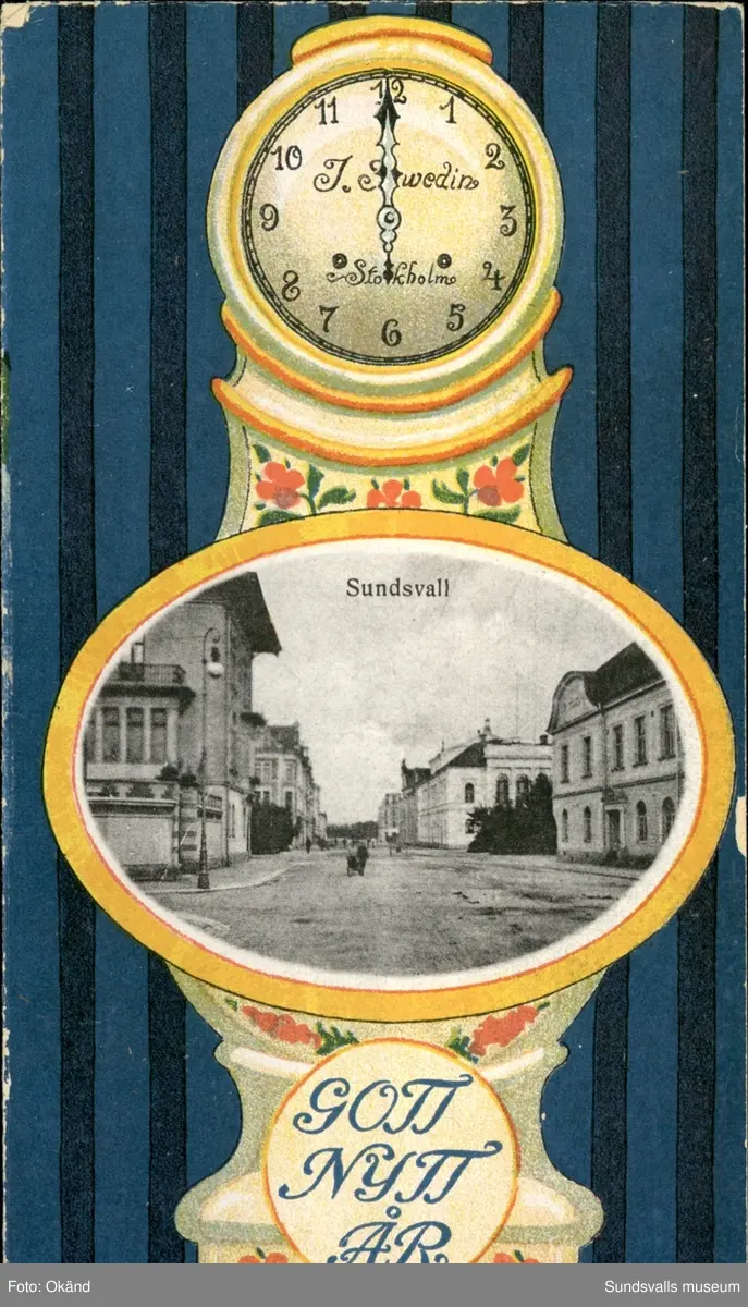 Vykort med ett Sundsvalls motiv infällt i bilden av ett golvur. Gott nytt år hälsning.