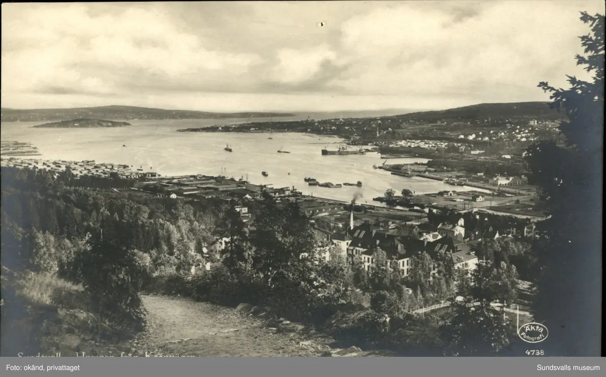 Vykort med motiv över Hamnen i Sundsvall från Krönvägen.