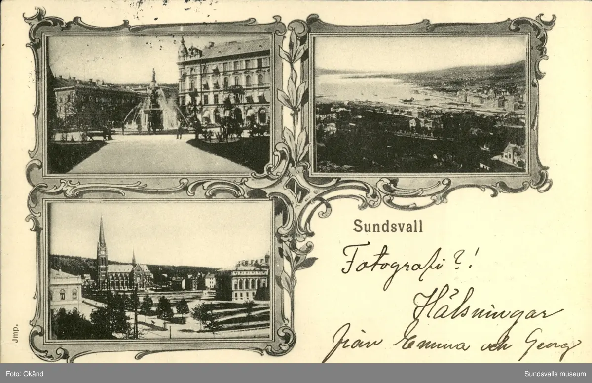 Vykort med motiv infällda av Vängåvan, Hamnen och Gustav Adolfs kyrka i Sundsvall.