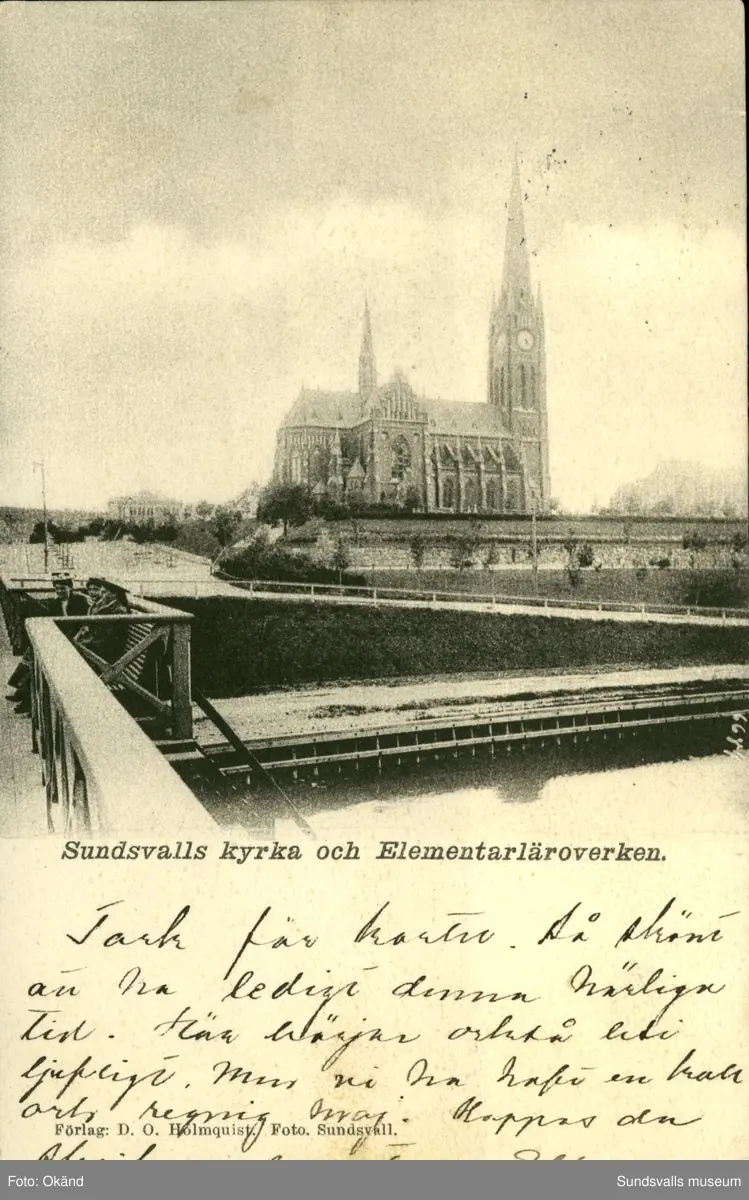 Vykort med motiv över Selångersån och Gustav Adolfskyrka i Sundsvall.