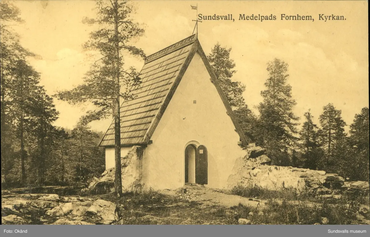 Vykort med motiv över Medelpads fornhem på Norra Stadsberget i Sundsvall med texten: Kyrkan.