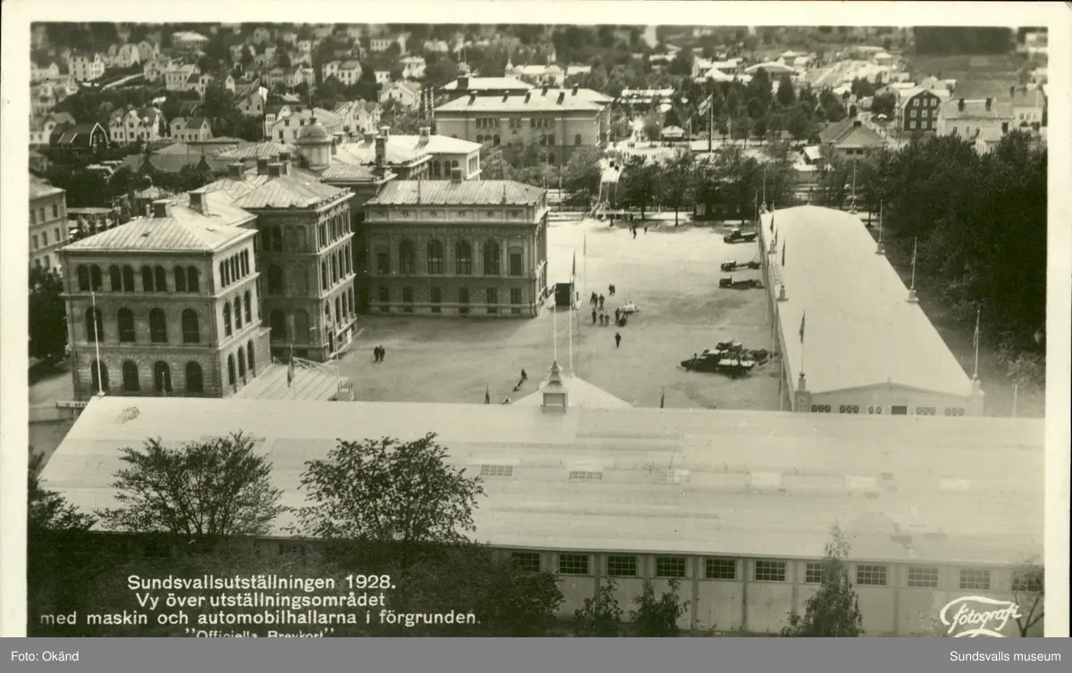 Vykort med motiv över Sundsvallsutställningens utställningsområde med maskin och automobilhallarna i förgrunden.