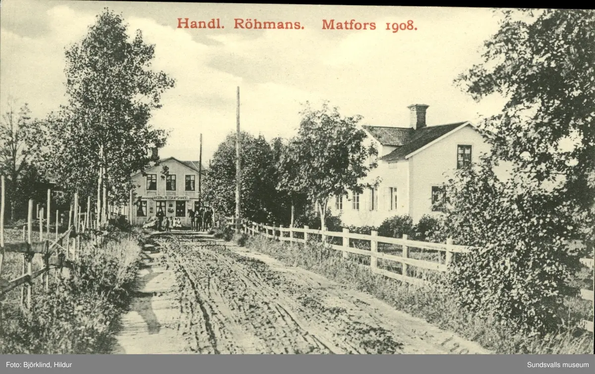 Vykort med motiv över Handlare Röhmans åkdon- och redskapshandel i Matfors.
