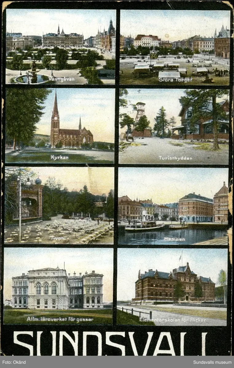 Vykort med motiv över Vängåvan, Stora torget, Kyrkan, Turisthyddan, Tivoli, Hamnen, Allmänna läroverket och Elementärskolan i Sundsvall.