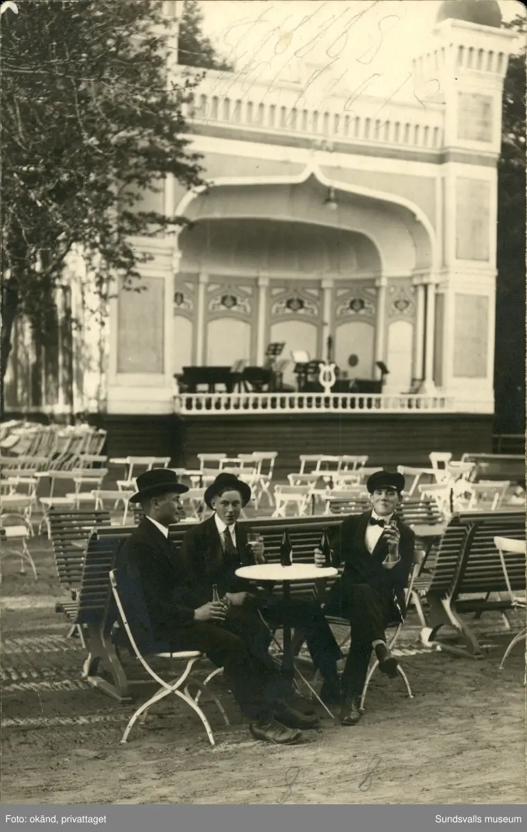Vykort med motiv över tre sittande unga herrar vid musikpaviljongen på Tivoli i Sundsvall.