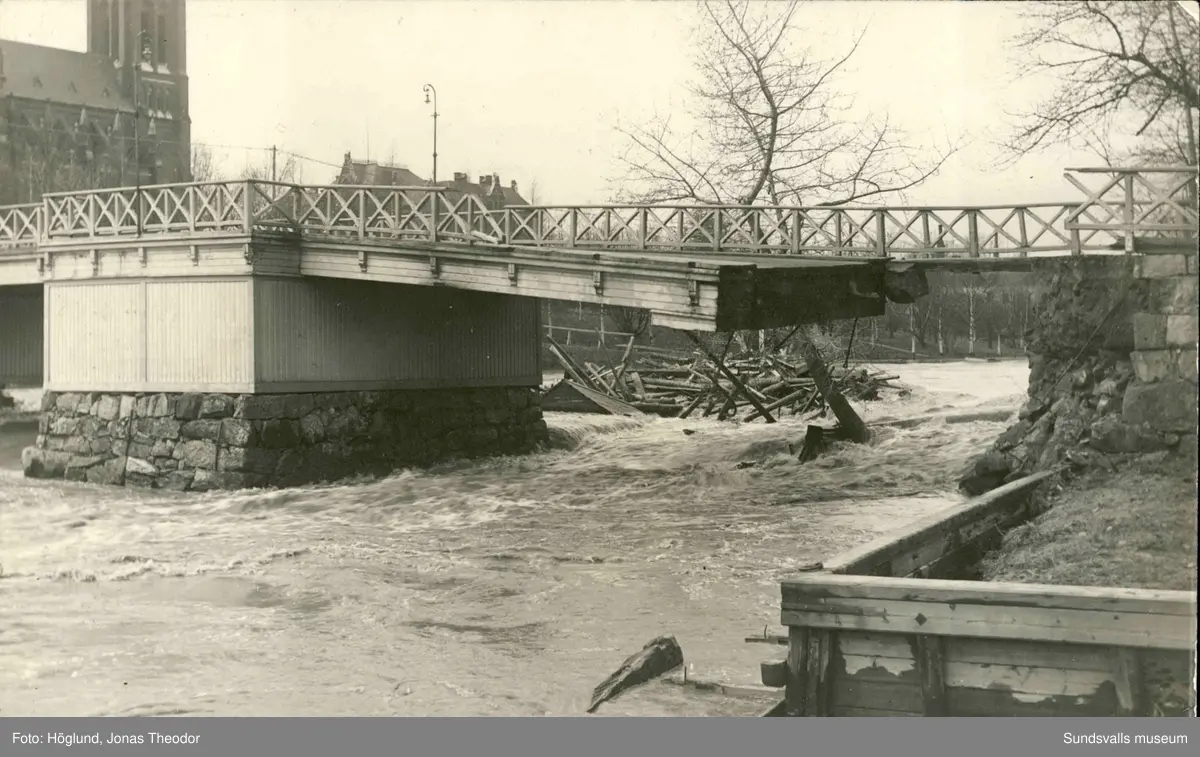 Vykort med motiv över Storbron vid Selångersån under översvämningarna i Sundsvall 1919.