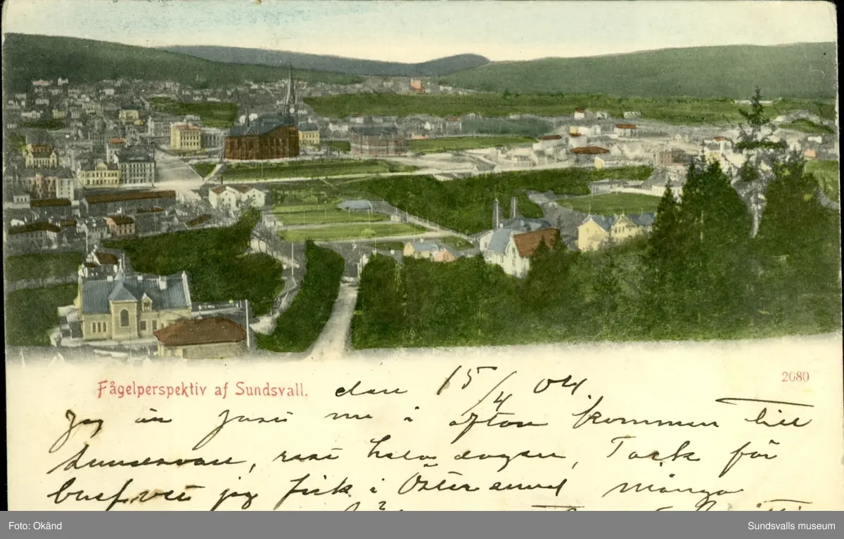 Vykort med motiv över parti av Sundsvall och Gustav Adolfs kyrka.