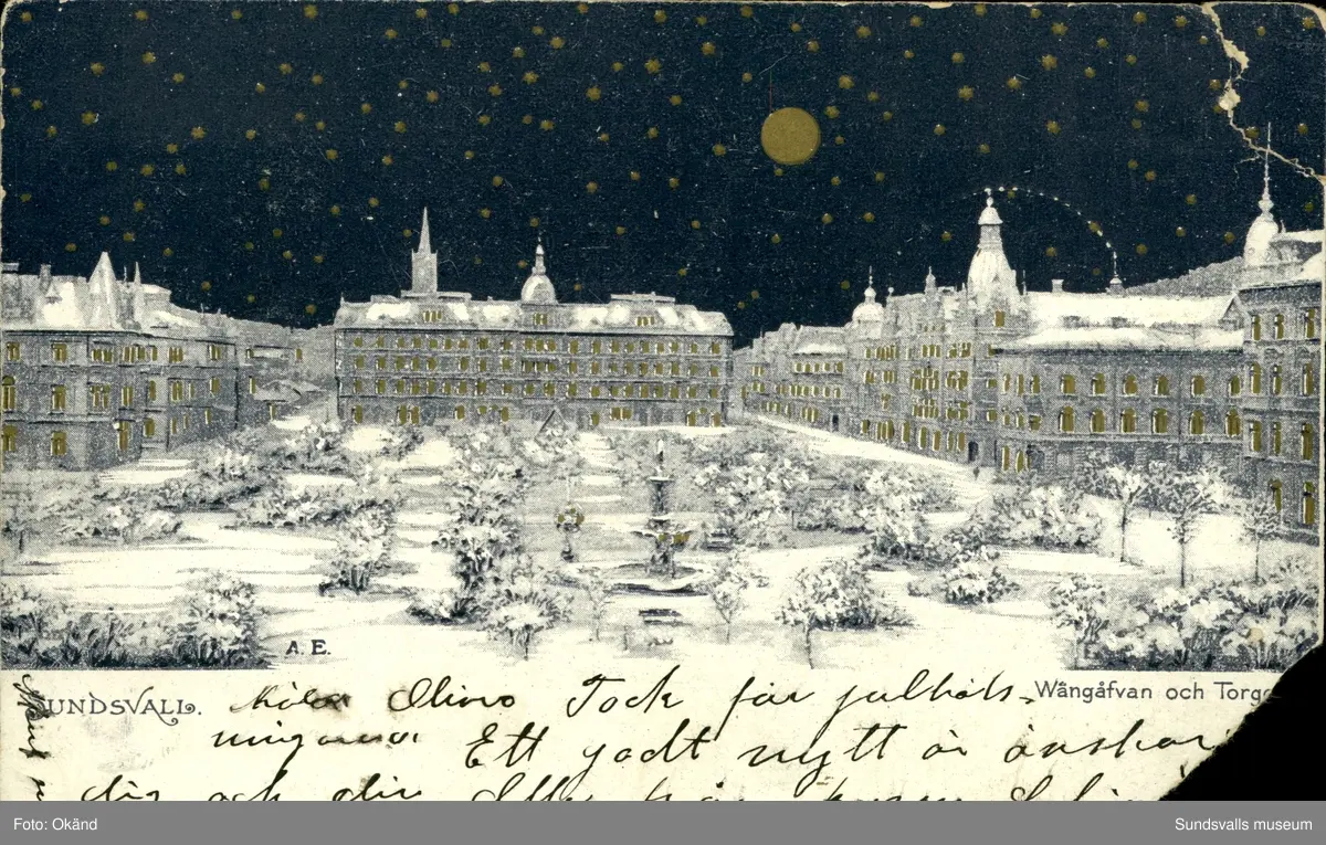 Vykort med motiv över Vängåvan och Stora torget i Sundsvall.