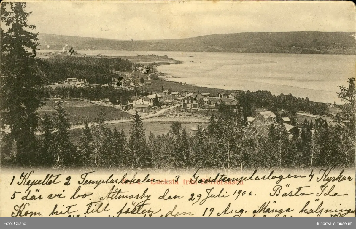 Vykort med motiv över Lucksta sett från Sörforsåsen i Matfors.