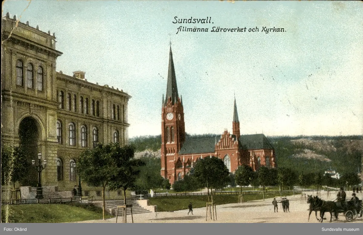 Vykort med motiv över Allmänna Läroverket och Gustav Adolfs kyrka.