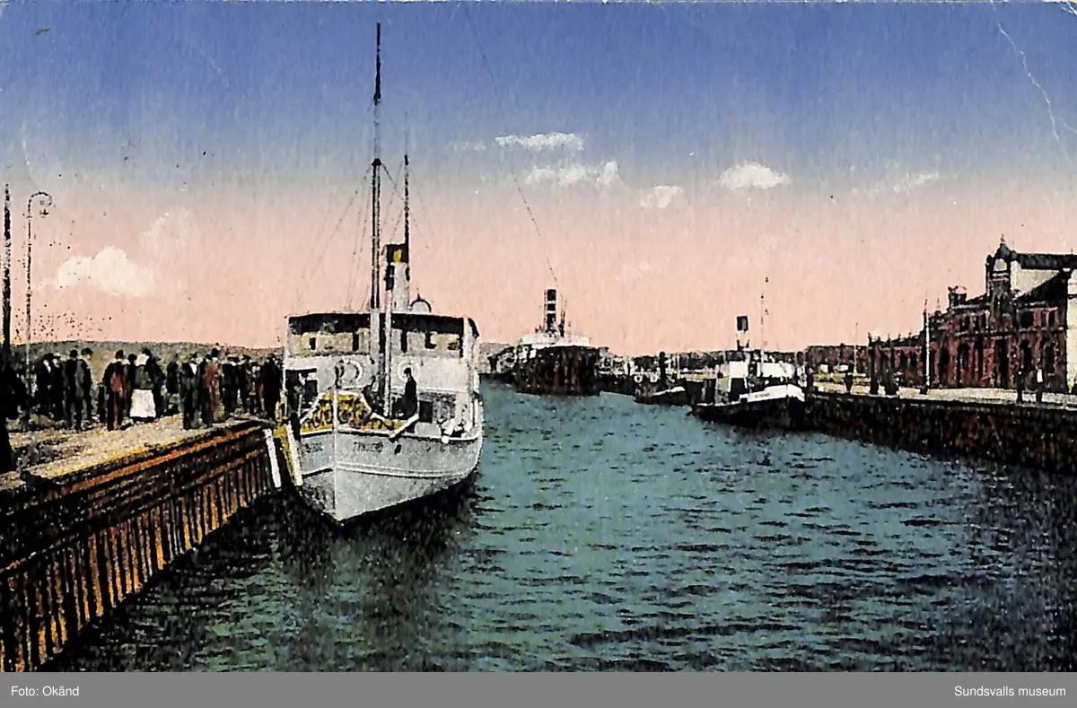 Vykort med motiv över passagerarbåtarna i hamnen i Sundsvall.