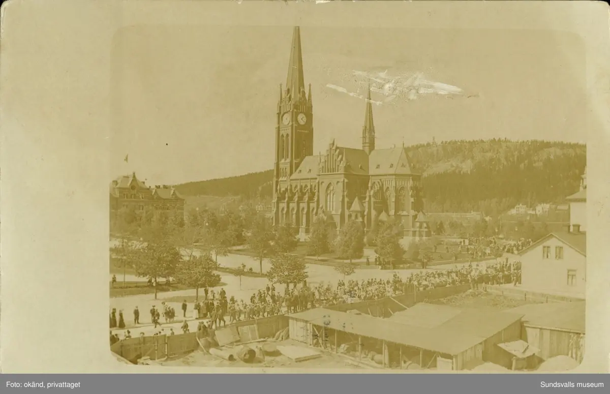 Vykort med motiv över Skolhusallén med Gustav Adolfs kyrka i bakgrunden under barnens dag i Sundsvall.