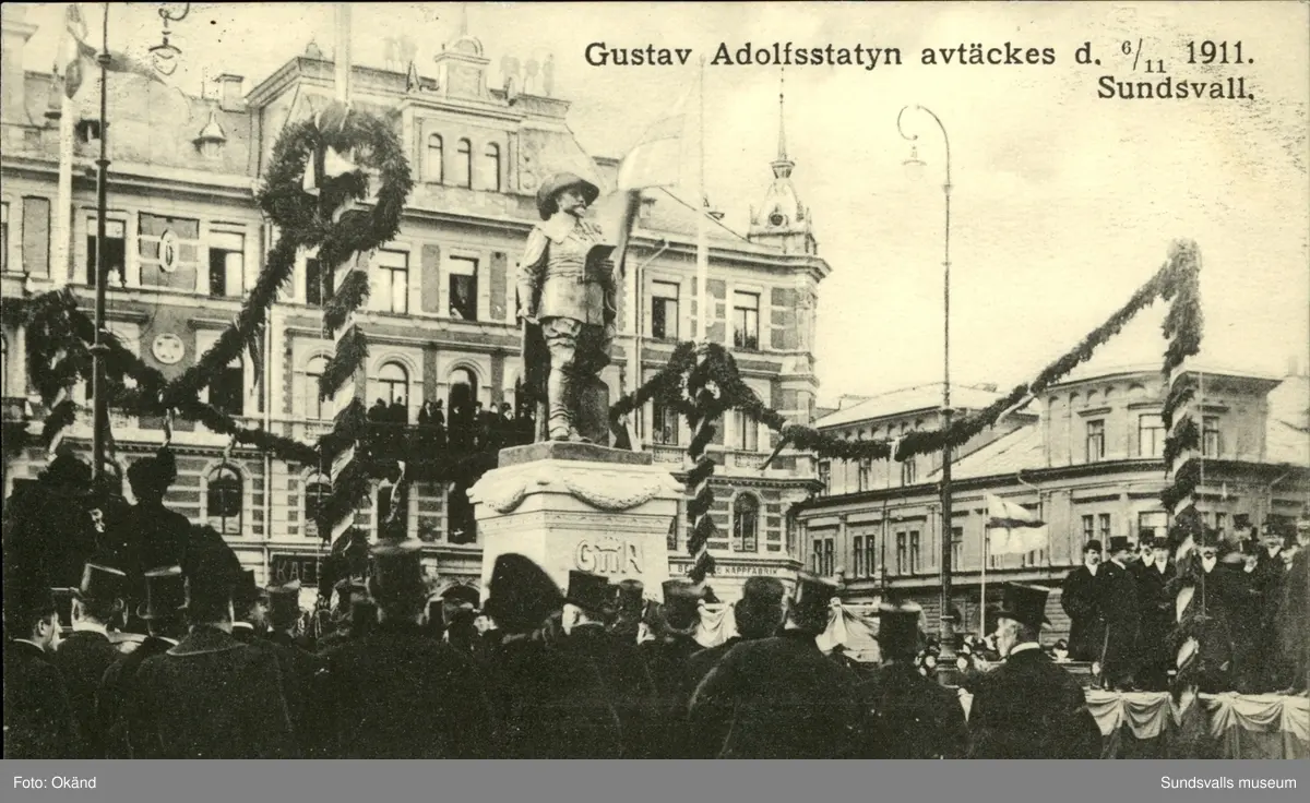Vykort över invigningen och avtäckningen av statyn över Gustaf II Adolf på Stora torget i Sundsvall.