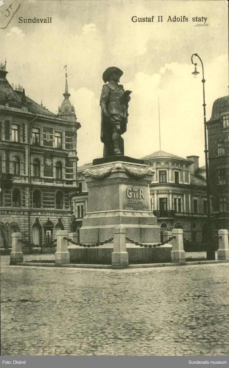 Vykort över statyn av Gustaf II Adolf som står på Stora torget i Sundsvall.
