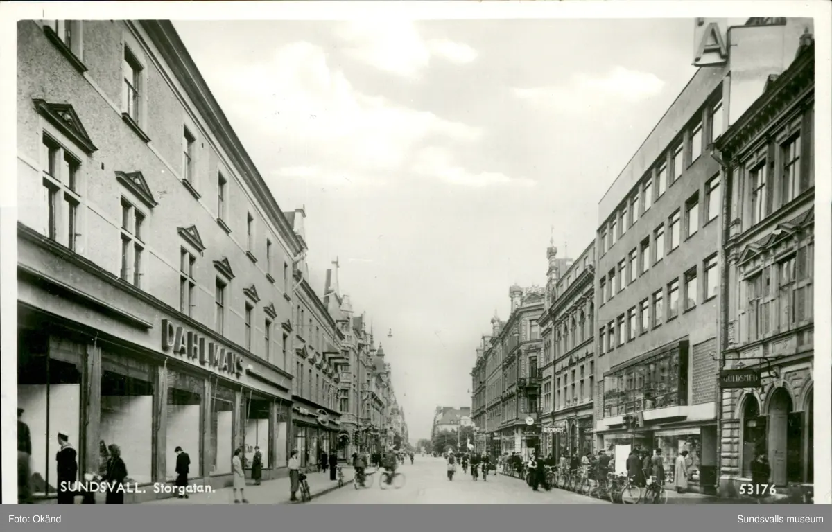 Vykort över parti av Storgatan i Sundsvall med Dahlmans varuhus i förgrunden.