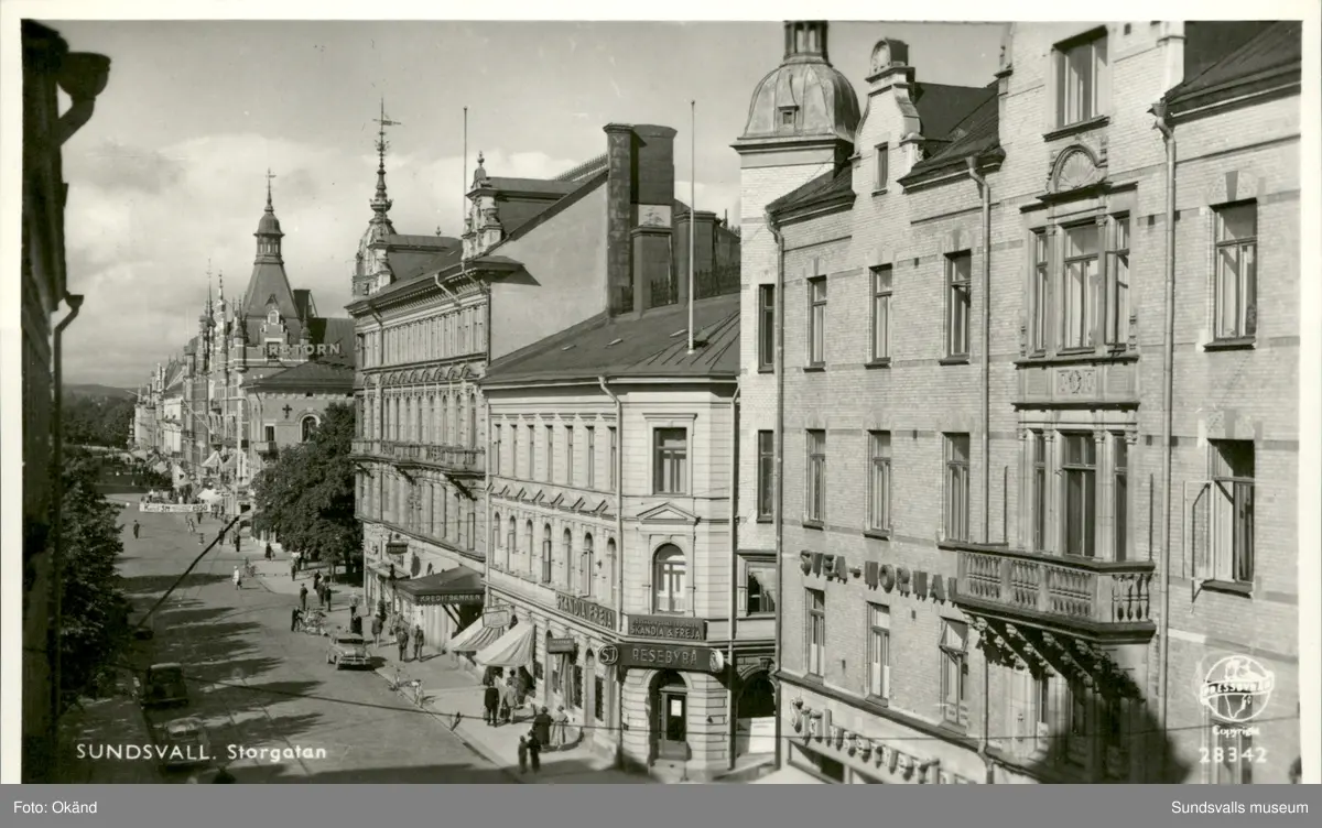 Vykort över parti av Storgatan i Sundsvall med Sj´s resebyrå i förgrunden. I bakgrunden en banderoll med texten Kanot SM 1950.