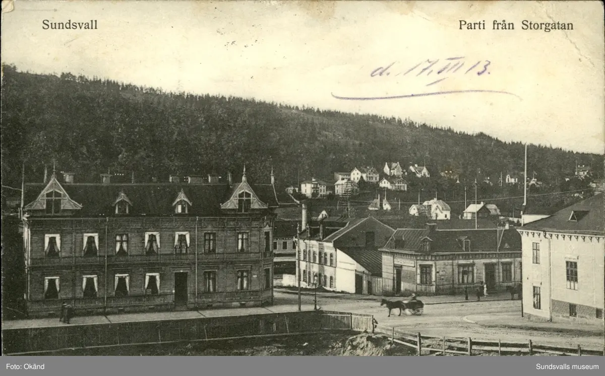 Vykort över parti av Storgatan med Norrmalm i bakgrunden.