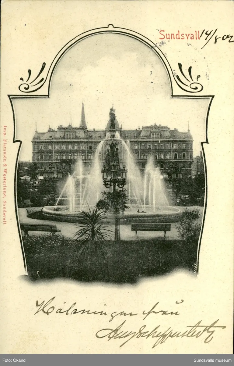 Vykort över fontänen Vängåvan i Sundsvall med bankhuset i bakgrunden.