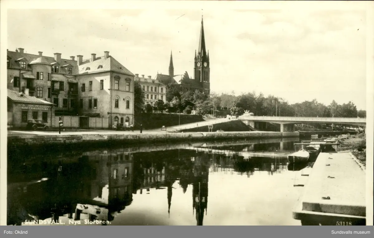 Vykort över nya Storbron och Gustav Adolfs kyrka i Sundsvall.
