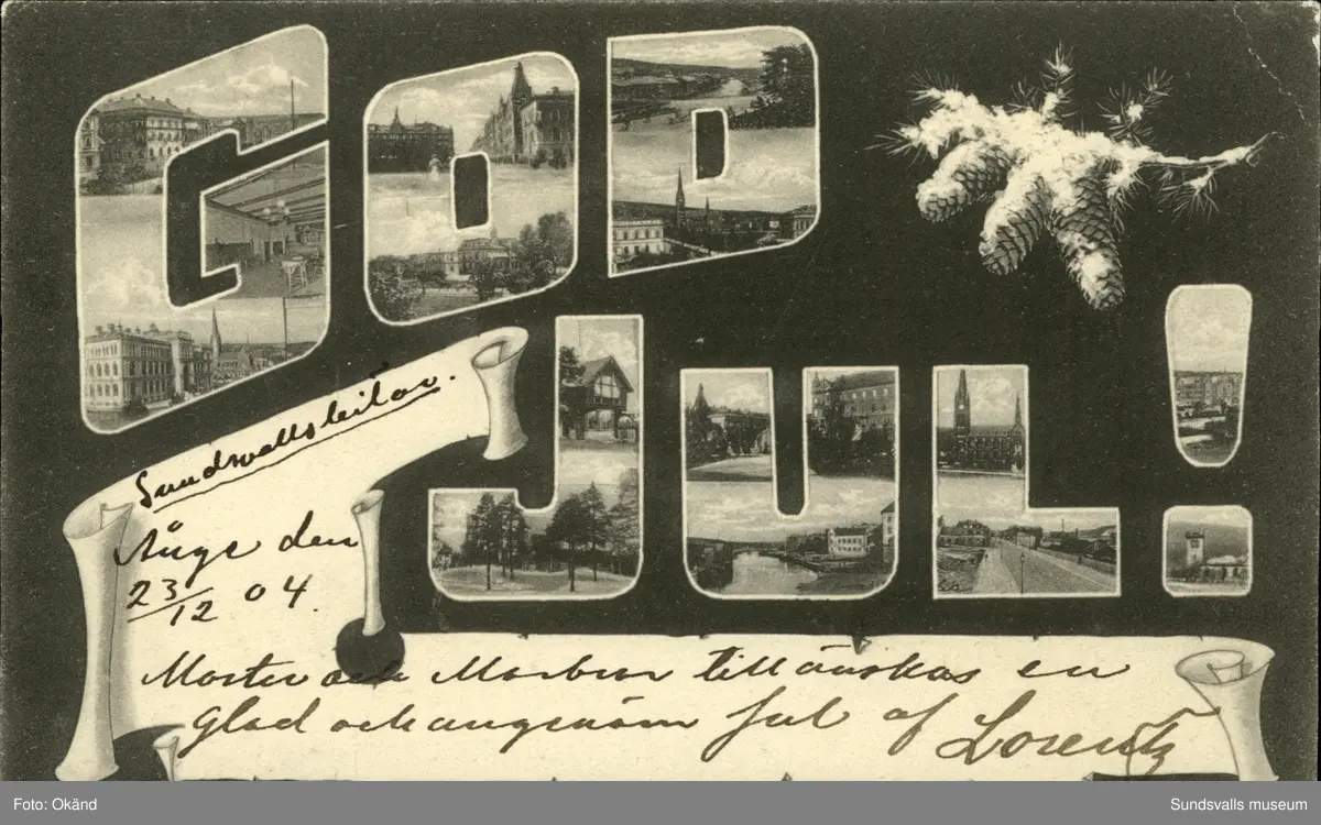 Vykort med texten God Jul i vilken det finns topografiska foton över Sundsvall.