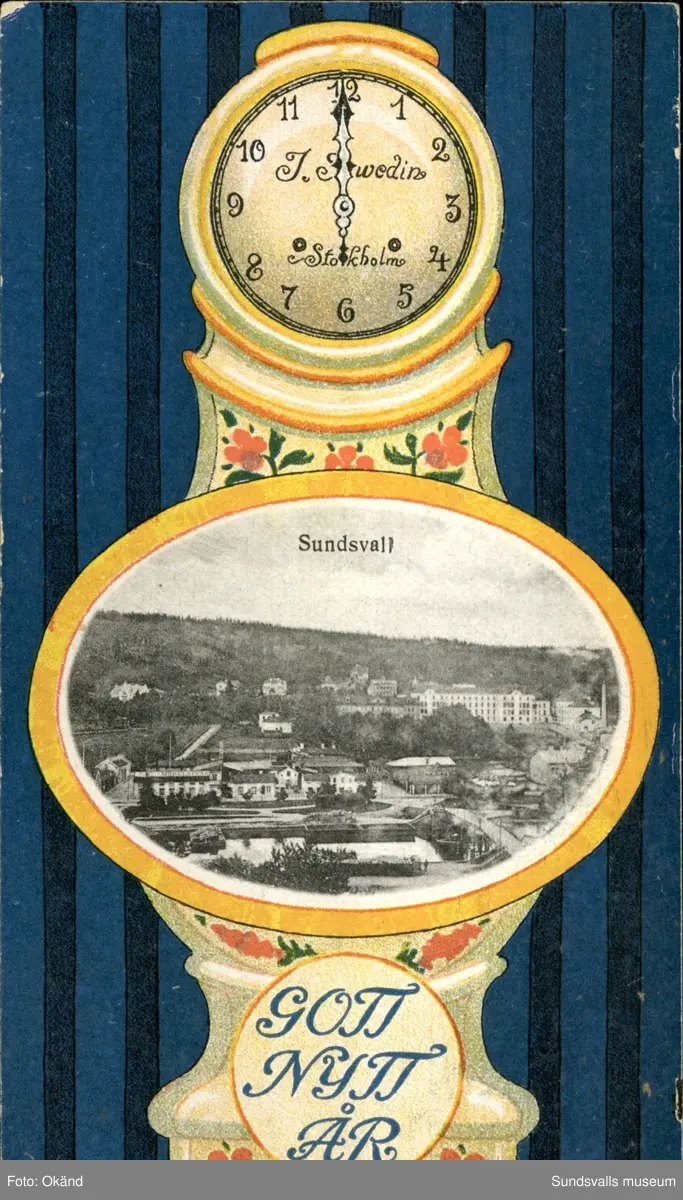 Vykort med ett Sundsvalls motiv infällt i bilden av ett golvur. Gott nytt år hälsning.