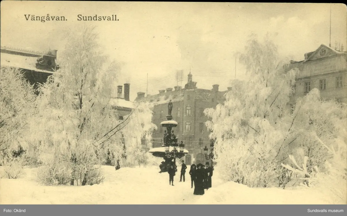 Vykort över ett vintervitt Vängåvan i Sundsvall.
