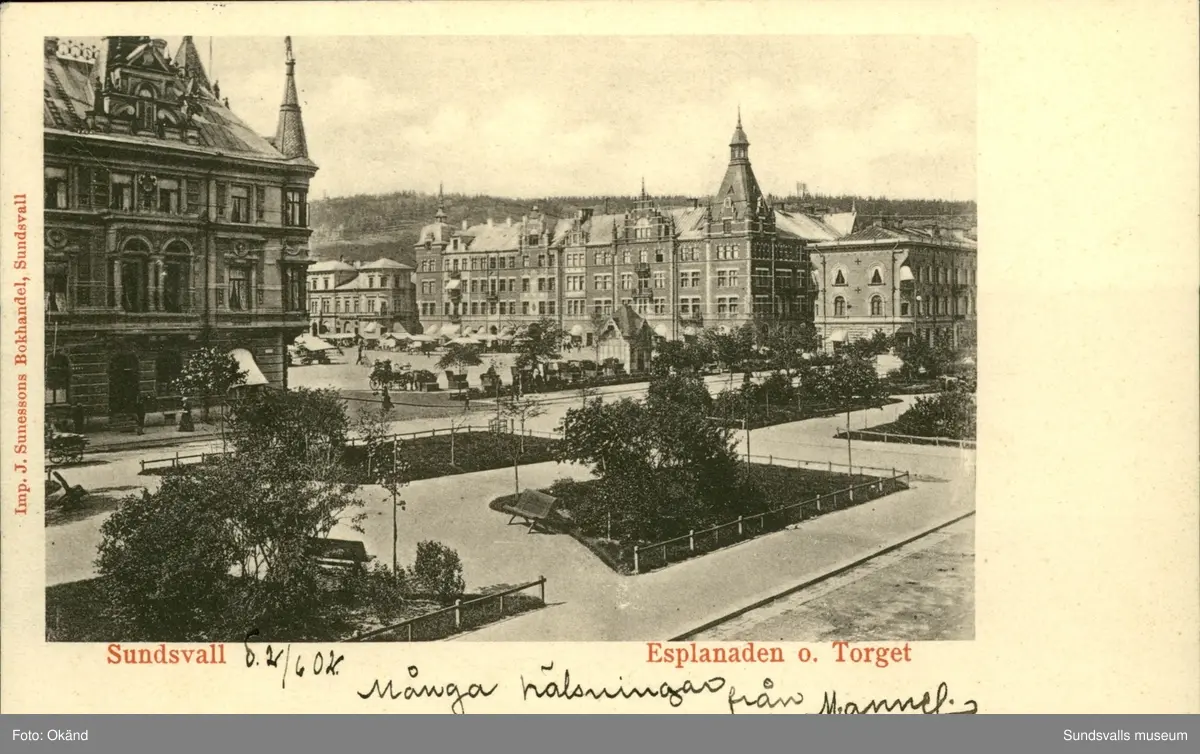 Vykort över Esplanaden och Stora torget i Sundsvall.