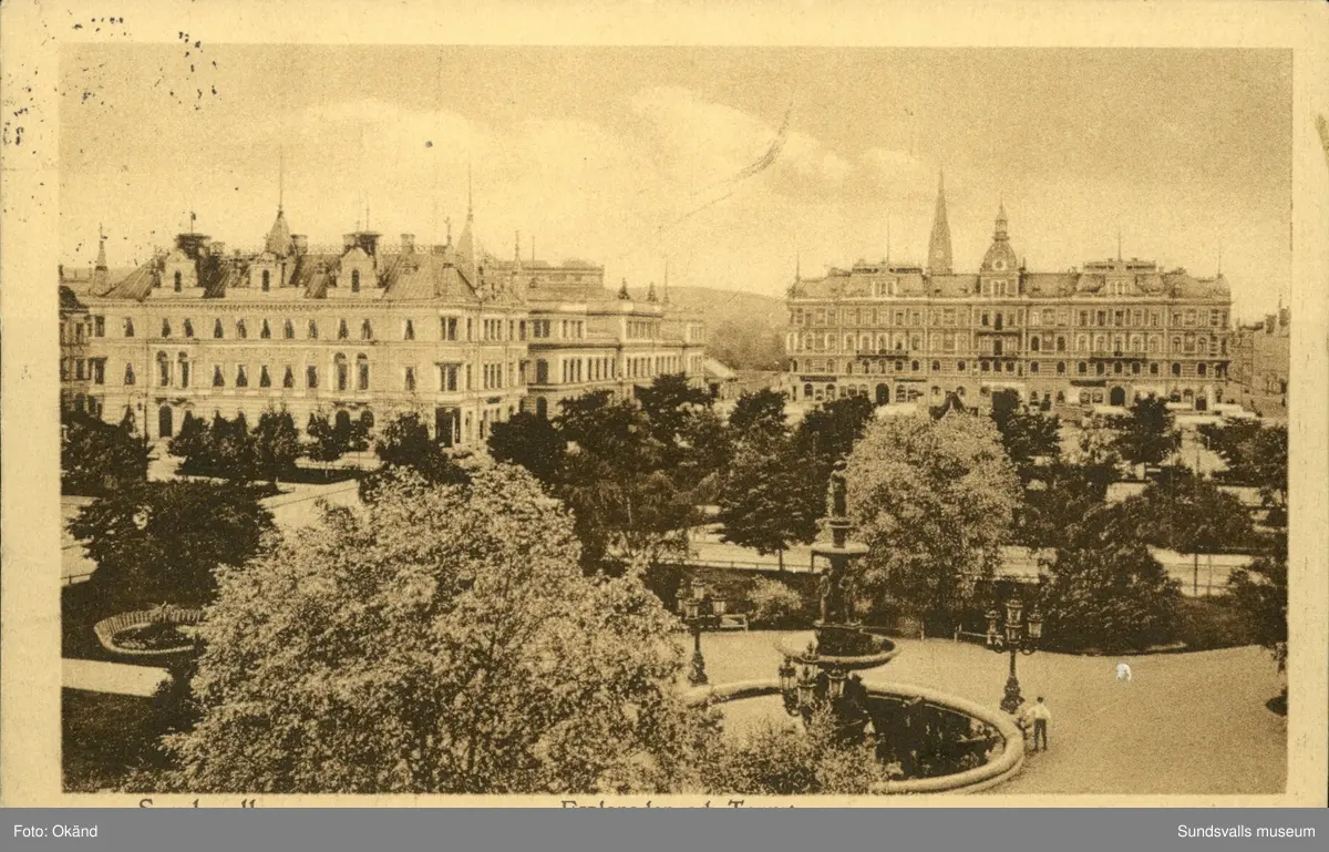 Vykort med motiv över Esplanaden och torget i Sundsvall.