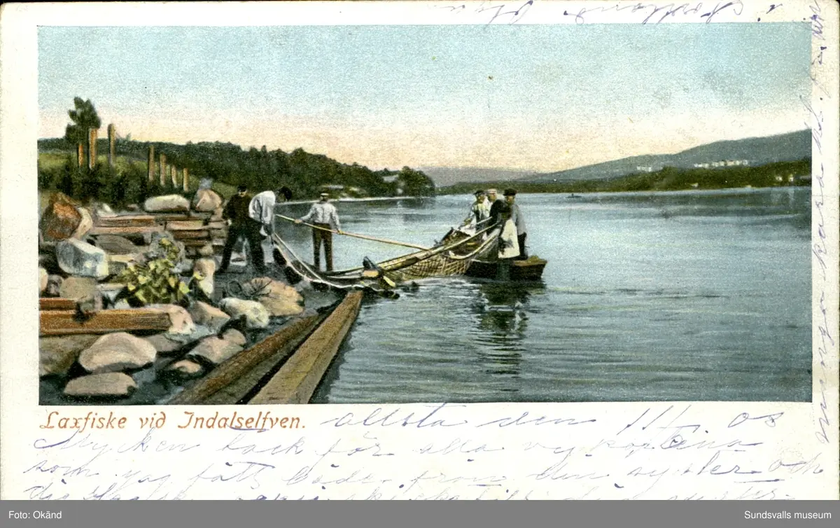 Titel: Vykort med motiv över laxfiske i Indalsälven.