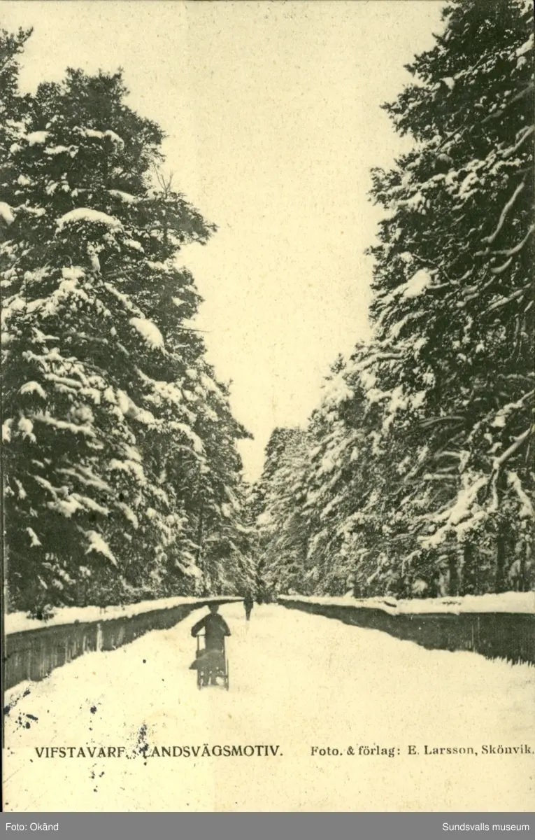Vykort med vintermotiv över landsväg i Vivstavarv.